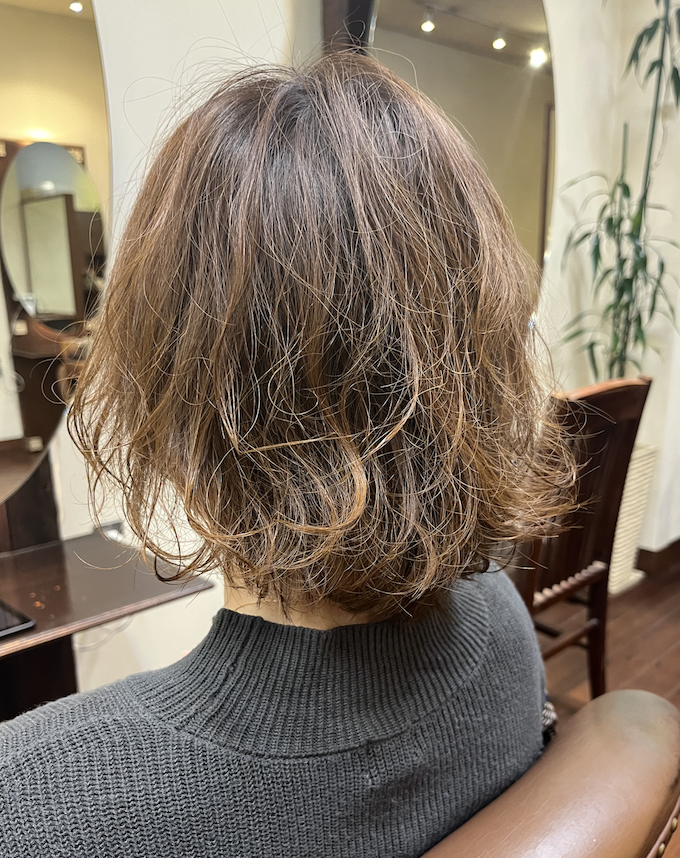 ご来店時はパーマスタイルで、髪の長さは肩にかかるくらいでした。